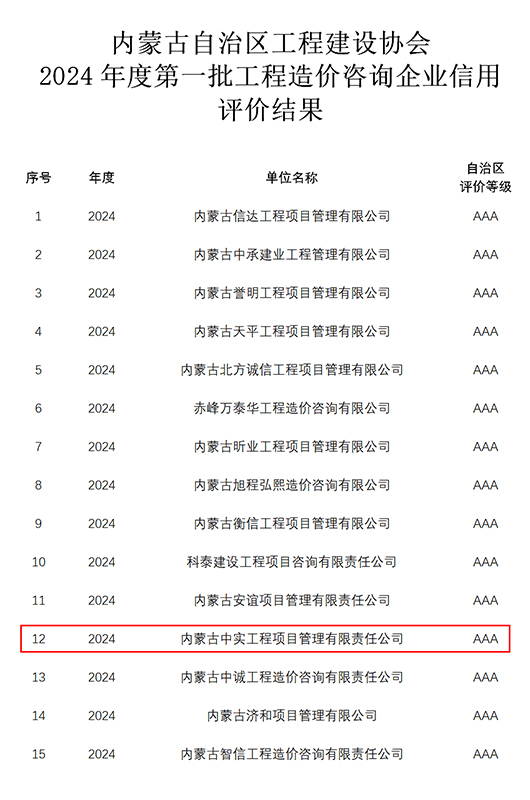 2024-07-3014816 次近期,我公司参加内蒙古自治区工程建设协会组织的“2024年度第一批工程造价咨询企业信用”申报,获得“信用AAA级证书”。我公司成立多年以来,遵循中国工程造价管理协会对造价咨询企…